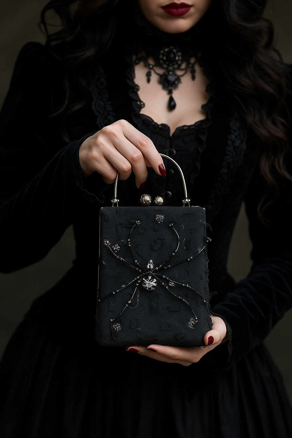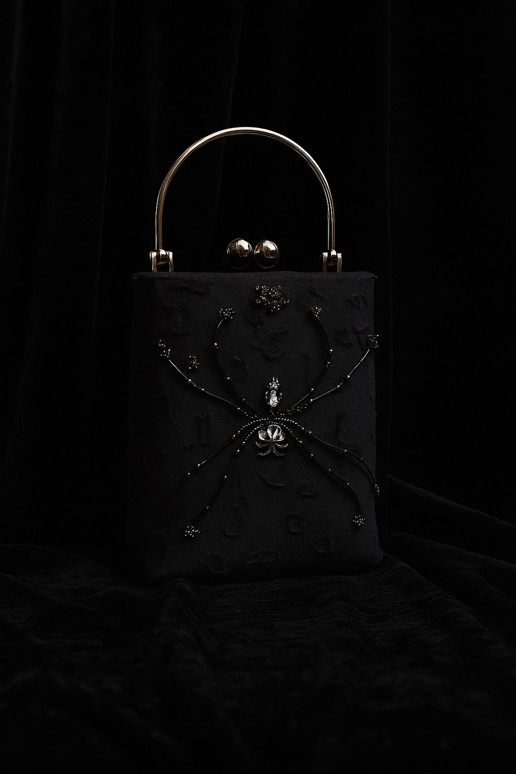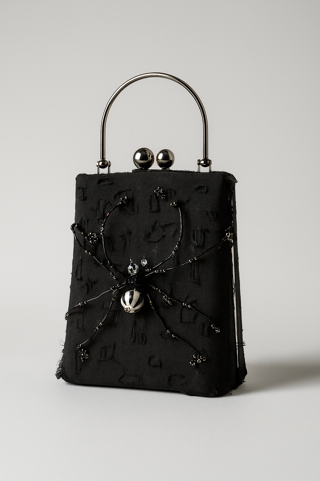 A haunting elegance woven in darkness, the Midnight Serpent bag captures the bold allure of night through its hand-embellished spider motif, meticulously crafted with glass beads, metal beads, and pearls that glimmer like moonlight against shadow.