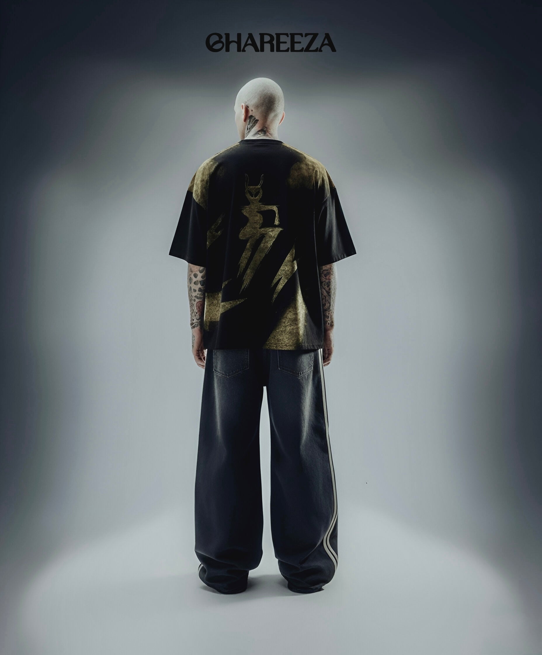 The Space Shadow Tee is built from 260 GSM 100% premium French terry cotton. The front features spray-effect and screen- printed alien artwork in gold mustard tones, set against a space shadow backdrop. Ghareeza official designer artwork and design, crafted by hand, ensures each piece carries its own unique character.